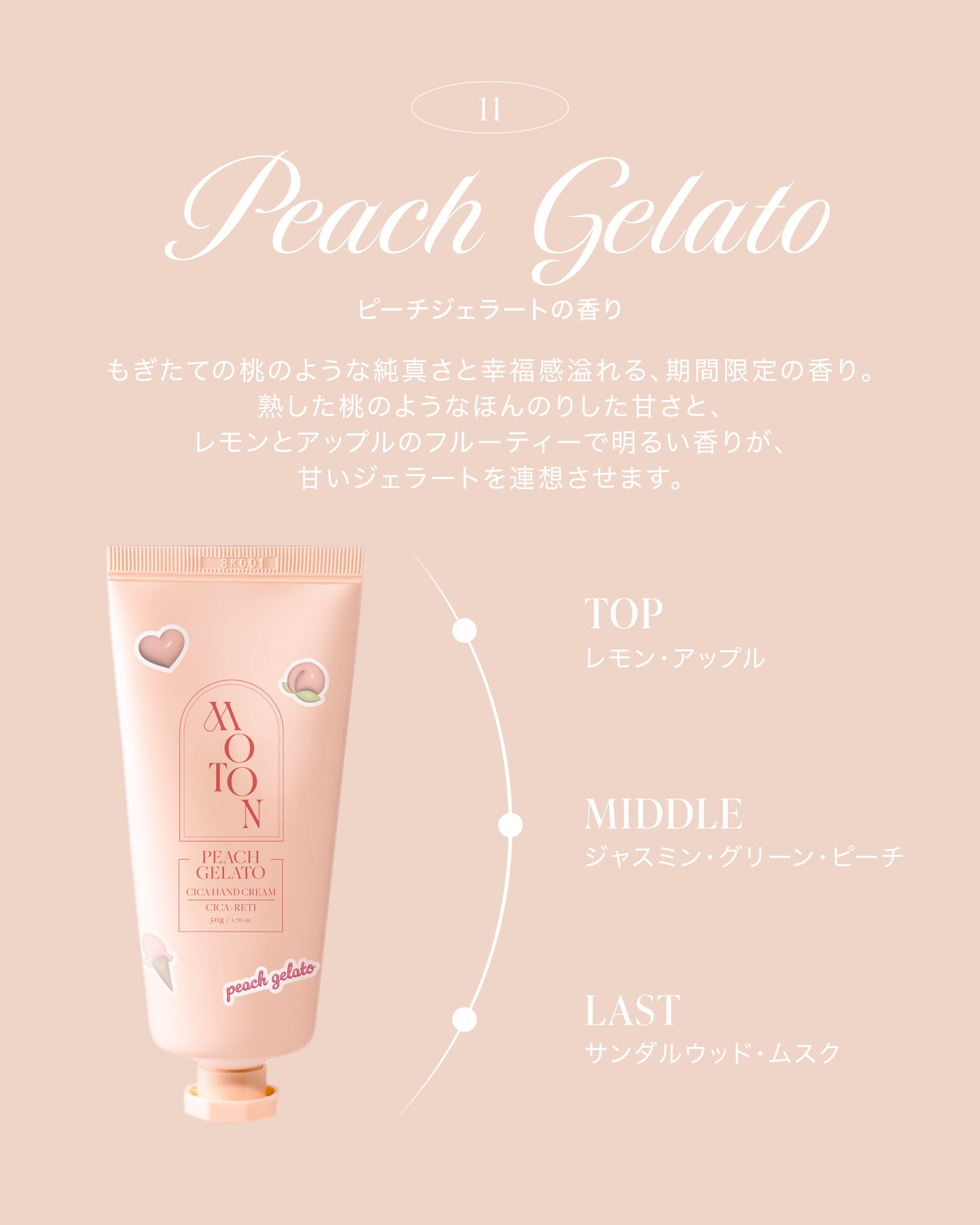 レモンやアップルといった甘いジェラートを彷彿とさせるトップノートからまるでもぎたての桃のようなピーチと華やかなジャスミンが咲き誇るミドルノートへと変化。ラストにはさっぱりとしたムスクやサンダルウッドが全体を包み込む甘くて芳醇な幸福感の溢れる香りとなっております。