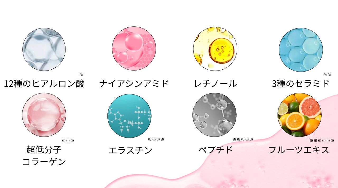 *ヒアルロン酸Na,ヒアルロン酸アスコルビル,ヒアルロン酸,ヒアルロン酸K,ヒアルロン酸ヒドロキシプロピルトリモニウム,加水分解ヒアルロン酸,加水分解ヒアルロン酸Na,ヒアルロン酸クロスポリマーNa,アセチルヒアルロン酸Na、**セラミドNP,セラミドAP,セラミドEOP、***加水分解コラーゲン、****加水分解エラスチン、*****パルミトイルペンタペプチド-4,オリゴペプチド-2,(アルギニン/リシン)ポリペプチド、******リンゴ果実培養細胞エキス,アセロラ果実エキス,グレープフルーツ果実エキス,アーチチョーク葉エキス,パパイア果実エキス,モモ果実エキス