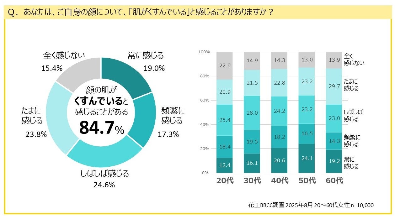 ■くすみを感じる頻度:くすみを感じることがあると答えた人は全体の84.7%。年代差は大きくないが、30・40・50代は、くすみを感じる頻度が高い傾向が見られた。