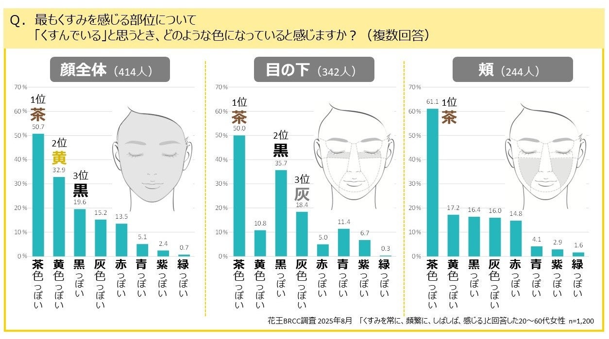 ■くすみの色:部位によって、感じている色み(複数回答)は少し異なる結果に。顔全体ではTOP3が「茶色」(50.7%)「黄色」(32.9%)「黒」(19.6%)の順に。目の下では「茶色」(50.0%)「黒」(35.7%)「灰色」(18.4%)の順であった。頬では、2位以下と大差で「茶色」(61.7%)が1位。
