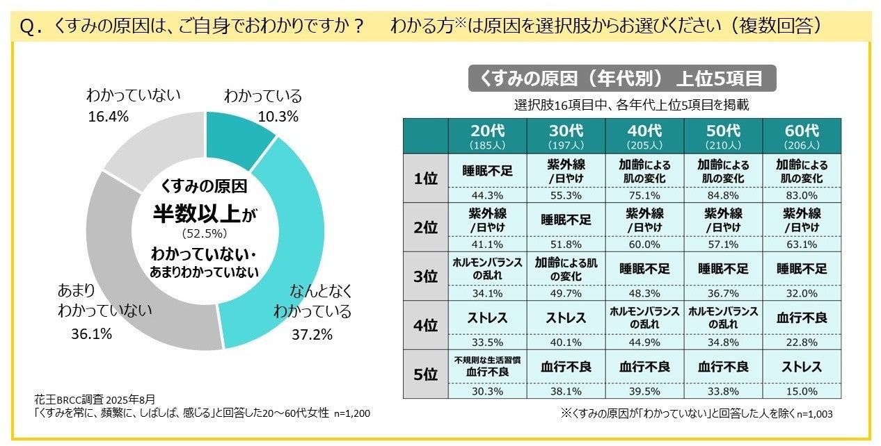 くすみを感じている人に、ご自身でその原因をわかっているかどうかをお聞きしました。その結果、「わかっている」と答えたのは全体の1割(10.3%)と少なく、「わかっていない」「あまりわかっていない」と答えたのは全体の半数以上(52.5%)でした。続いて、原因がわかる方(「わかっていない」と答えた人を除く全員)に、ご自身のくすみの原因について選択肢16項目から複数選んでいただきました。表に示すように、年代によって原因と思う項目の順位に違いがあり、20代では「睡眠不足」(44.3%)が最も多く、30代では「紫外線/日やけ」(55.3%)、40代以降は「加齢による肌の変化」が、それぞれ1位を占める結果となりました。