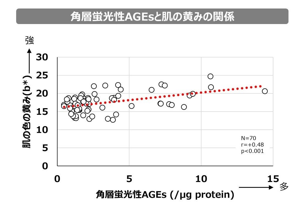 図:出典リンク 花王ニュースリリース 肌の黄みに角層AGEsが関連することを確認 植物エキス混合物により角層蛍光性AGEs形成を抑制 2024年5月31日)