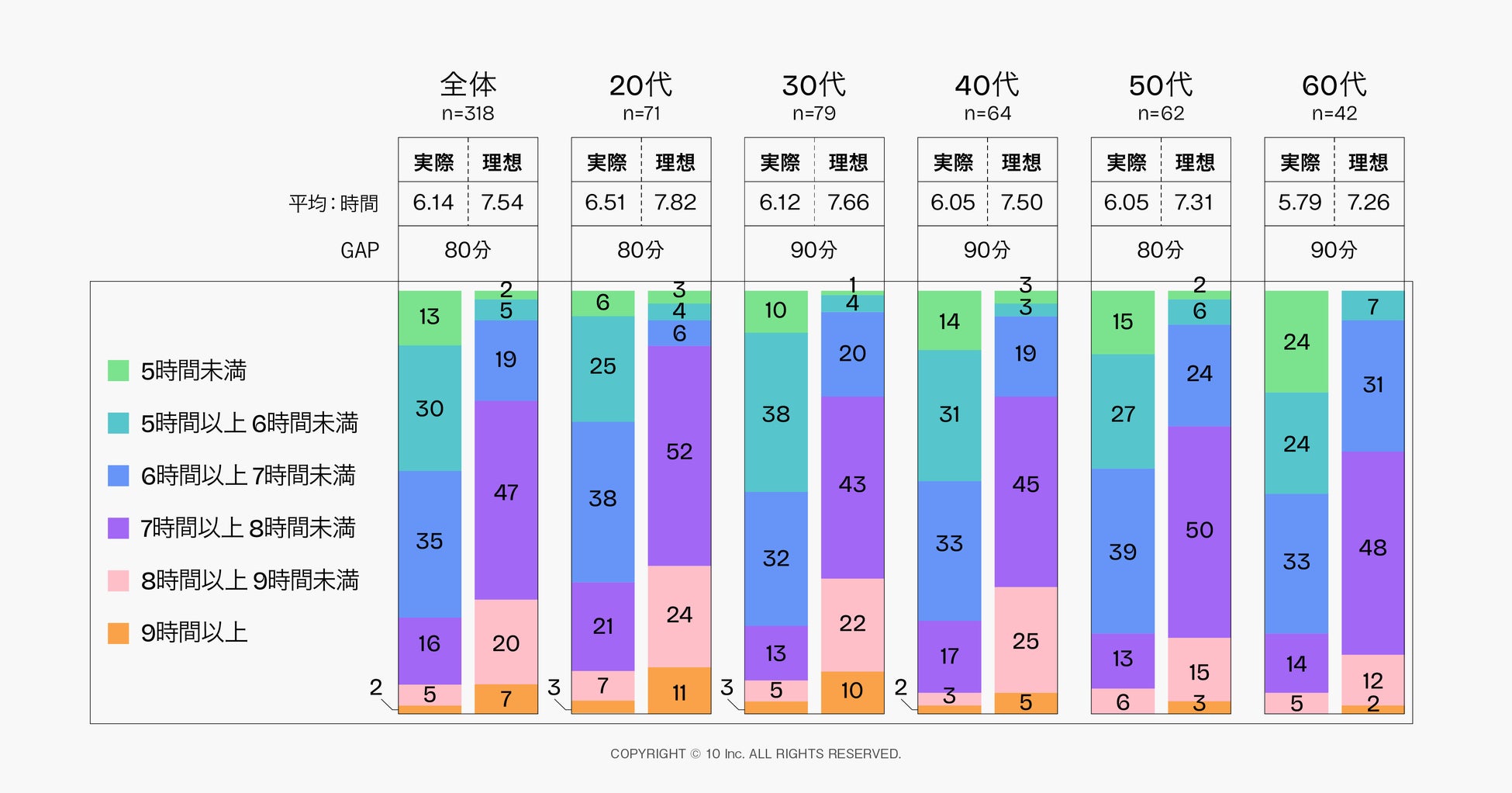 1. 睡眠時間:理想の睡眠時間は「7-8時間未満」に対し実態は平均80分少ない