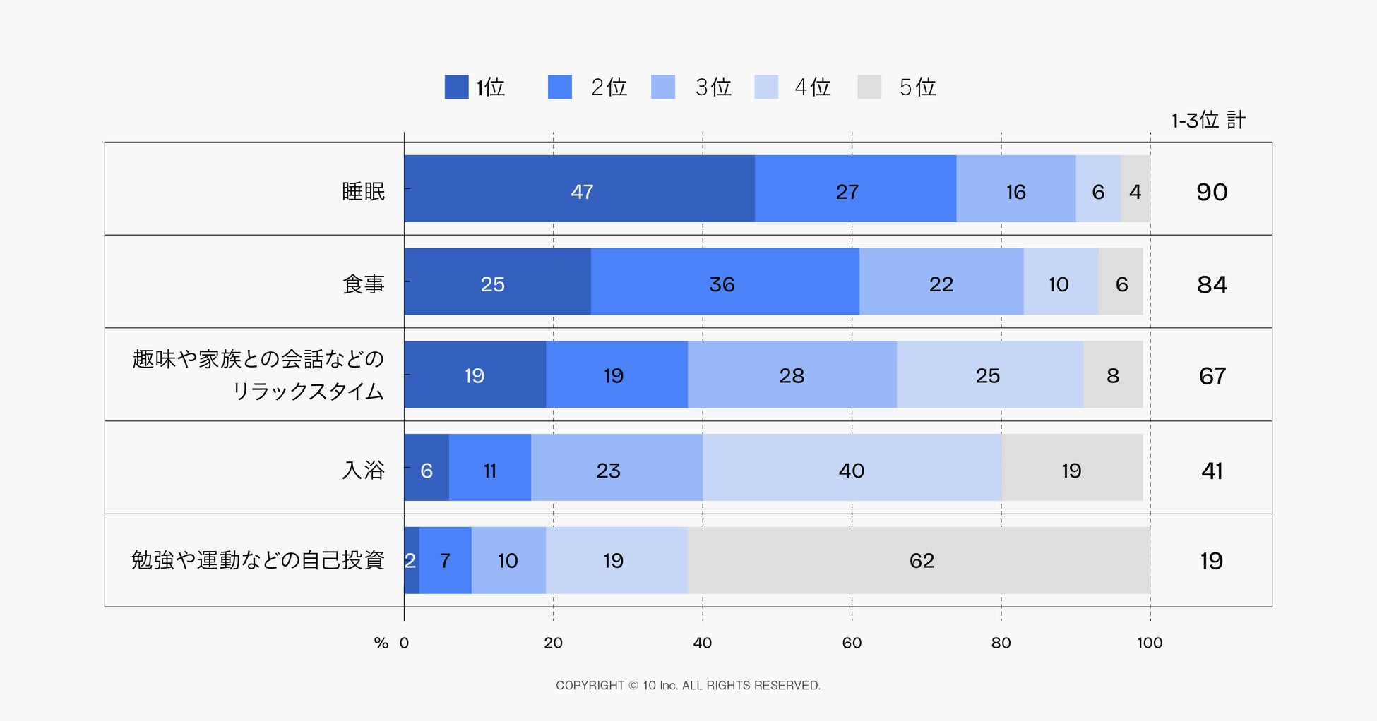 3. 睡眠の重要度:自分時間で「睡眠」が食事や趣味を上回る最重要項目に
