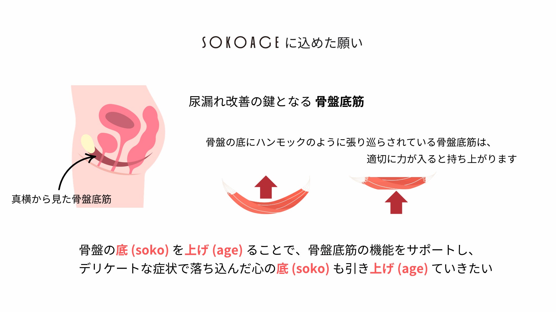 第一弾となる『sokoage(ソコアゲ)』では、骨盤底筋の“柔軟性”に着目し、「鍛える」だけでなく「ほぐして整える」という新しいセルフケアの形を提案しています。