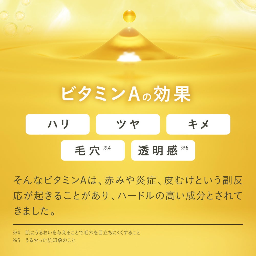 成分:水、グリセリン、BG、ナタネ油、コメヌカ油、ミリスチン酸ポリグリセリル-10、ジイソステアリン酸ポリグリセリル-2、トリ(カプリル酸/カプリン酸)グリセリル、PEG-60水添ヒマシ油、シア脂、オリーブ果実油、カニナバラ果実油、ホホバ種子油、スクワラン、マカデミア種子油、セタノール、レチノイン酸ヒドロキシピナコロン、ワレモコウエキス、ユズ果実エキス、コンフリー葉エキス、セイヨウオオバコ種子エキス、アロエベラ葉エキス、ダイズ種子エキス、ヒアルロン酸Na、加水分解ヒアルロン酸、水溶性コラーゲン、加水分解コラーゲン、セラミドAP、セラミドNP、PCA-Na、乳酸Na、アルギニン、アスパラギン酸、PCA、グリシン、アラニン、セリン、バリン、プロリン、トレオニン、イソロイシン、ヒスチジン、フェニルアラニン、アラントイン、ツボクサエキス、クダモノトケイソウ種子油、水溶性プロテオグリカン、3-グリセリルアスコルビン酸、ティーツリー葉油、グレープフルーツ果皮油、レモン果皮油、マンダリンオレンジ果皮油、ベルガモット果実油、ステアリン酸グリセリル(SE)、カプリル酸グリセリル、ジメチルイソソルバイド、キサンタンガム、カルボマー、エチルヘキシルグリセリン、フェノキシエタノール、クエン酸、クエン酸Na、水酸化Na、EDTA-2Na