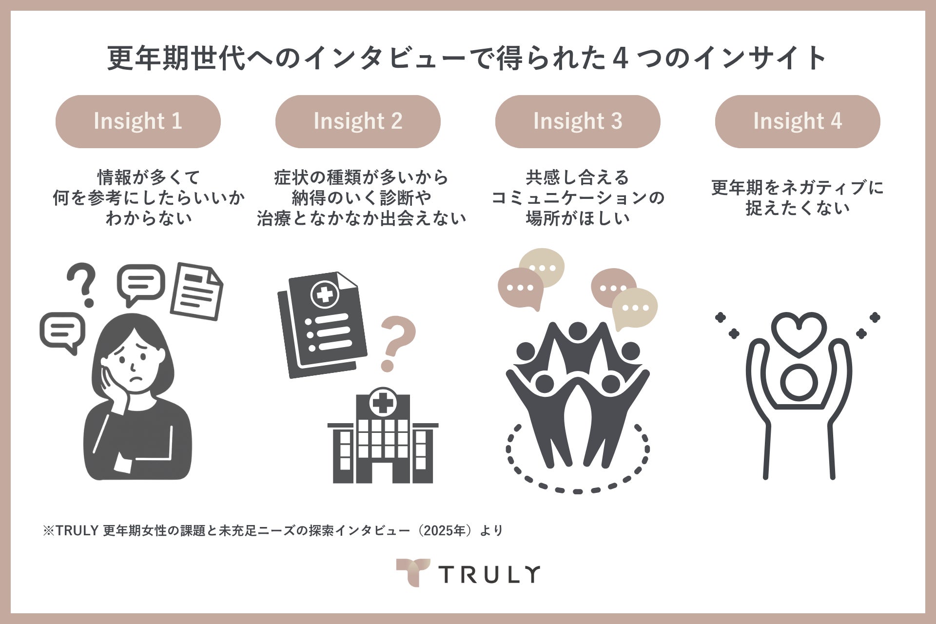 TRULYはTRULY Insightの始動にあわせて、更年期当事者のリアルな課題と、商品・サービスに対する潜在ニーズを深く理解するため、更年期世代の女性を対象にユーザーインタビューを実施しました。その結果、これまで十分に語られてこなかった共通の課題と、企業への切実な要望が浮き彫りになりました。