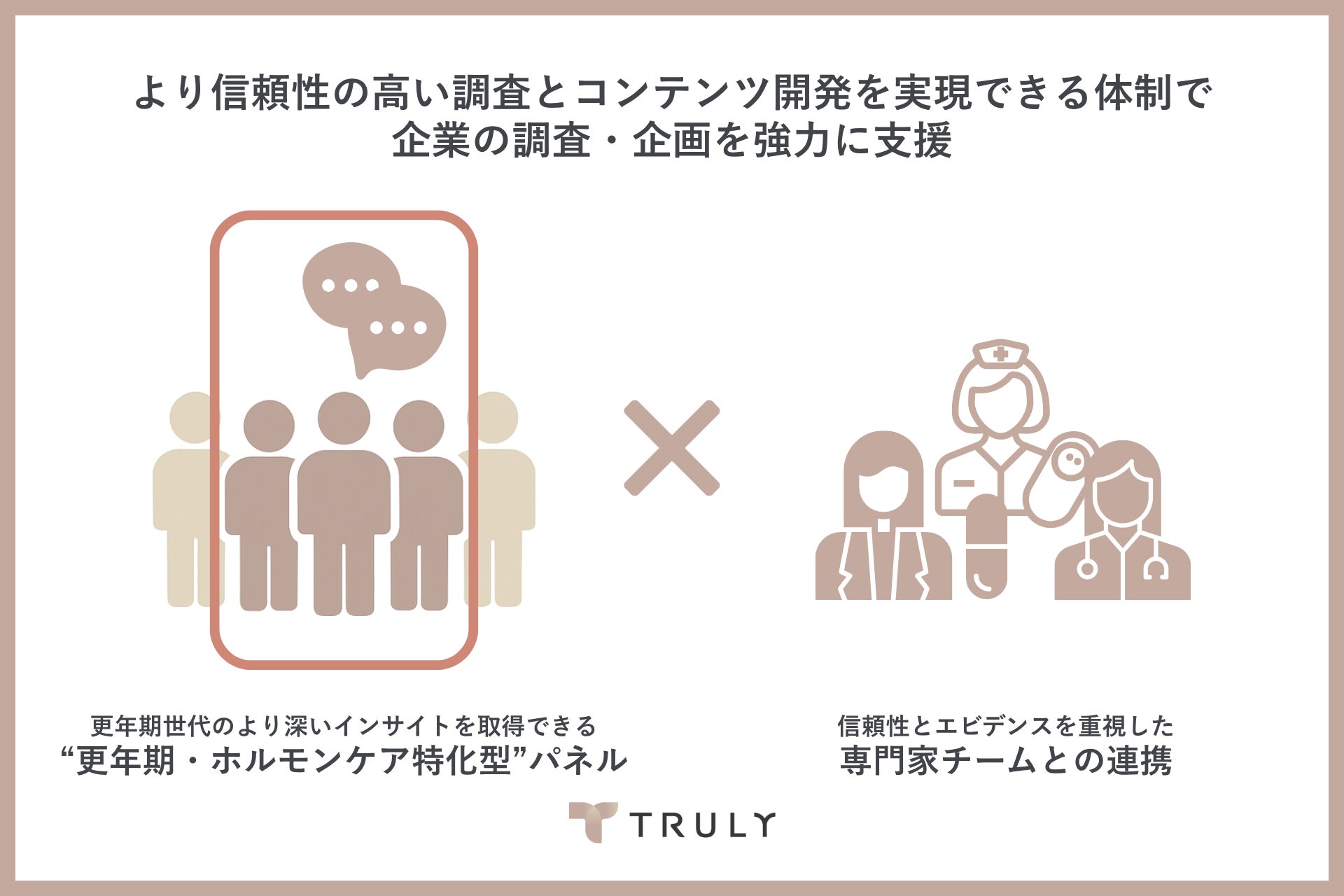 TRULY Insightでは、企業の課題解決を直接支援するパートナーシップに加え、“更年期・ホルモンケア特化型”の専門パネルとして、調査会社、広告代理店、コンサルティングファームを裏方で支えるソリューションも提供します。