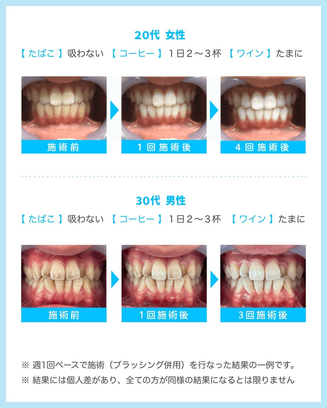 状態、汚れ、個人差にもよりますが自然な白さなら1回だけでなく3回以上の回数のコースを皆様がご希望されます。終了時のカウンセリングで各個人に合わせたプランをご提供、ご提案します。初回だけがカウンセリングも合わせると時間がかかりますが次回からはカウンセリングもないので30分で完了できるので時間も短いです。ご満足いただいているサービスを提供できるからこそ選ばれて運営を続けられている安心・安全のサロンです。