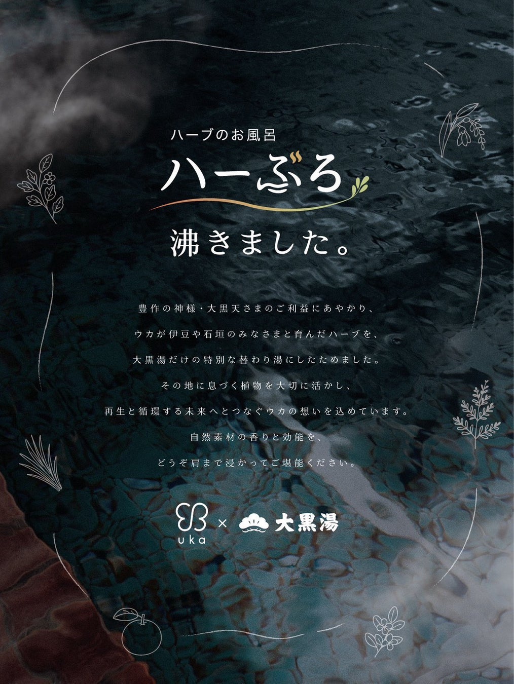 この度、トータルビューティカンパニーuka(@instauka、@ukacojp、@ukabeauty.co)は、2025年10月15日(水)より、東京・中目黒の銭湯・大黒湯と共同で企画するコラボレーション、”ハーぶろ”を実施いたします。72年の伝統があり、銭湯の日(10月10日)に営業再開した大黒湯。”ハーぶろ”とはukaが取り扱う伊豆産・石垣産の原料を中心としたハーブを湯に入れた替わり湯のことです。4か月にわたり週替わりで、提案していきます。期間中の売店ではuka製品の販売も。