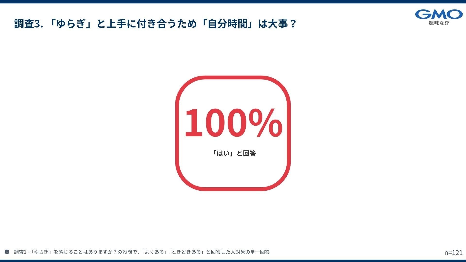 「ゆらぎ」と向き合ううえで「自分時間が大事」と答えた人は 100% にのぼりました。自分の時間を持つことがセルフケアの必須要素であることが明らかになりました。
