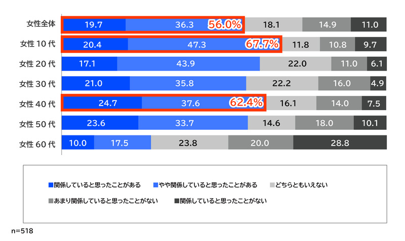 ・「性ホルモンの変化や乱れ」が関係している体の不調を感じている女性は56.0%。年代別で10代女性は67.7%と最も高く、次いで40代女性が62.4%で、思春期や更年期といった性ホルモンの変化が起こる年代が高い傾向。【図表4】