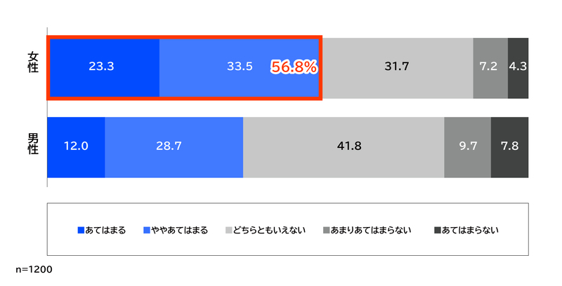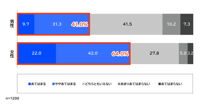 考える男性は41.0%。一方、女性は64.0%にも上り、男性との間に20ポイント以上の開きがある。