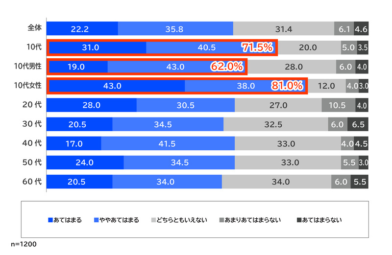 は、年代別では10代(71.5%)が最も高く、とりわけ10代女性(81.0%)が突出している。
