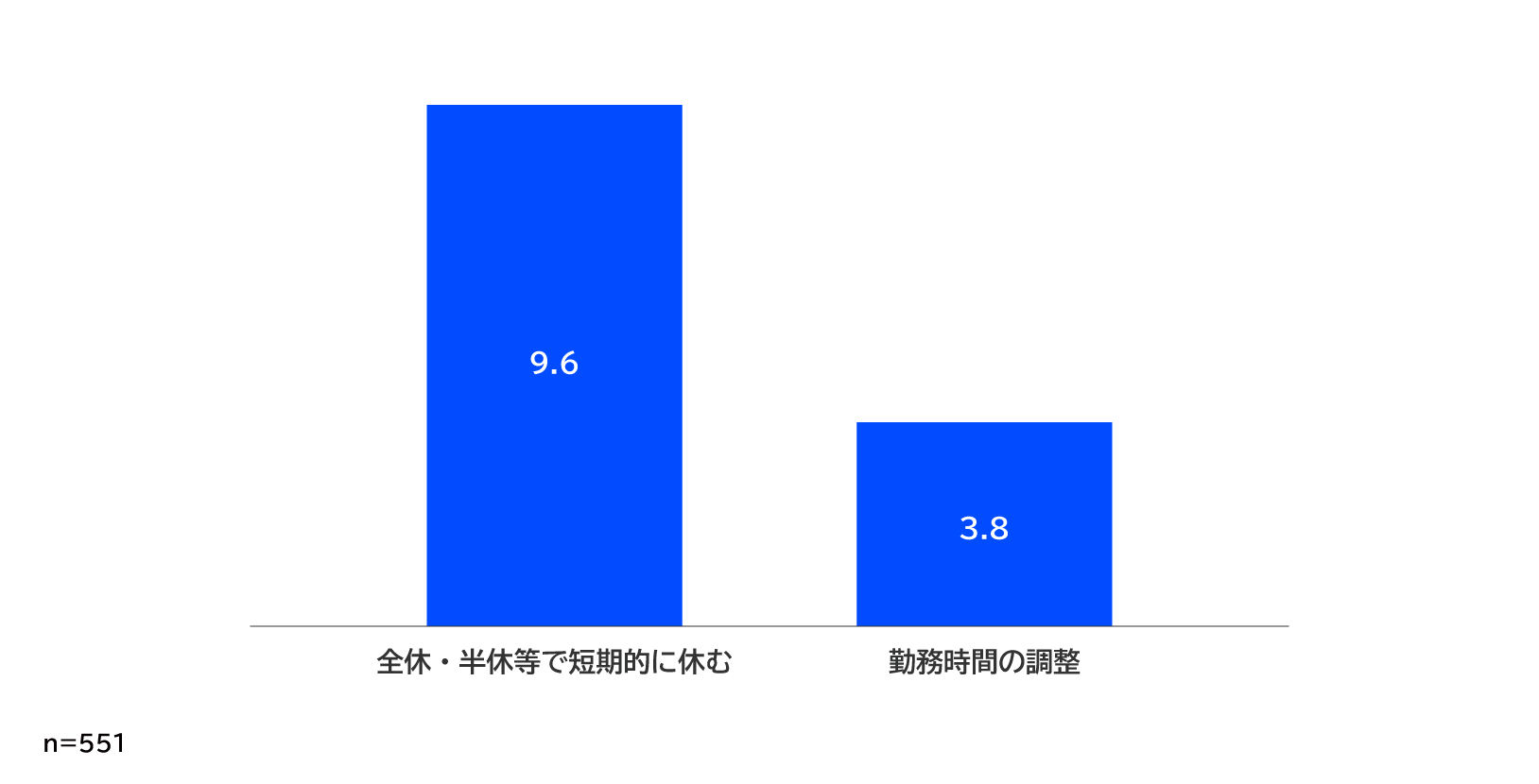 ・「性ホルモンの変化による心身の不調」によって全休・半休等で短期的に休んだことがある女性は9.6%。勤務時間の調整をしたことがある女性は3.8%。【図表6】