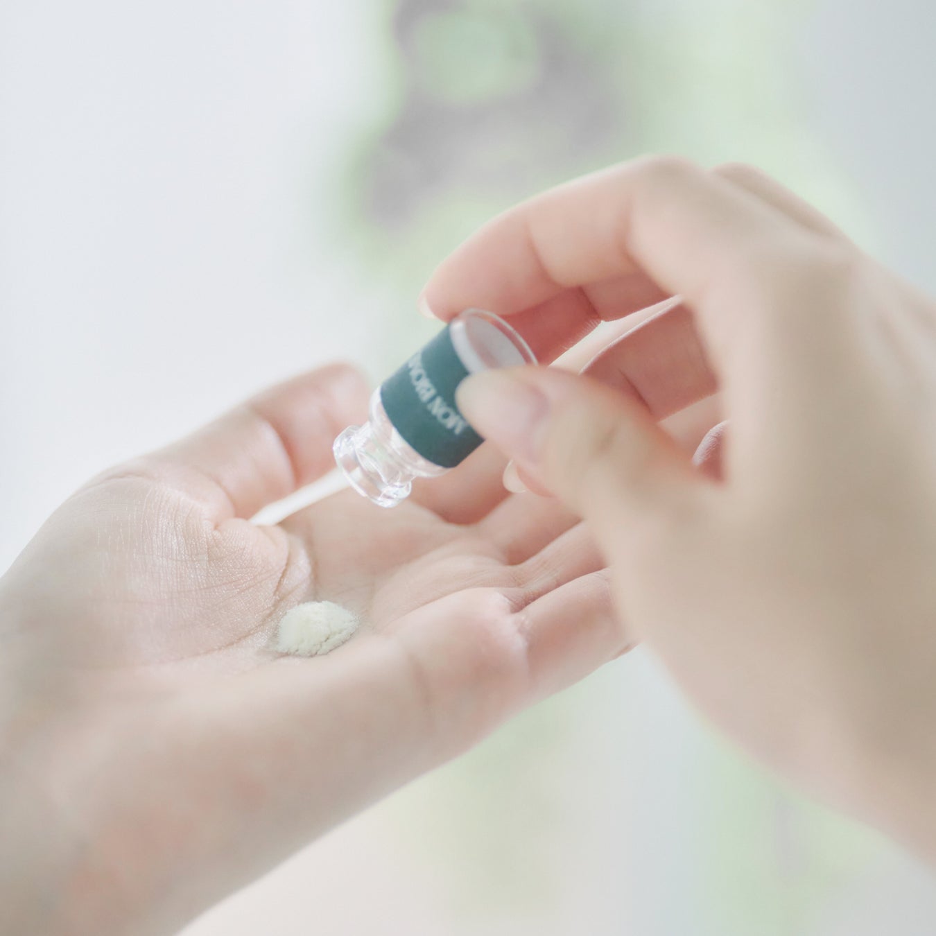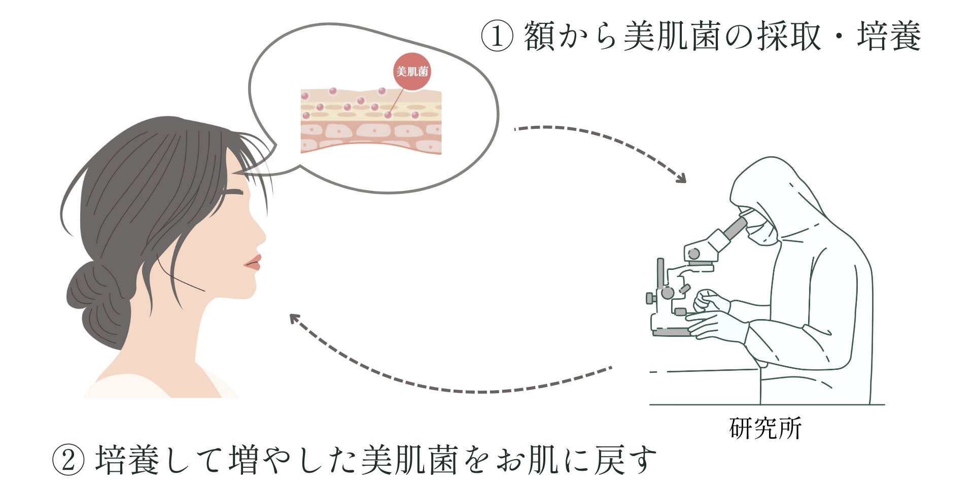 ご注文後、まずお客様の肌に棲む美肌菌を専用キットで採取し、提携研究所にて丁寧に分析、そして培養いたします。培養された美肌菌を凍結乾燥によって粉末化してお客様のもとへお届けし、お客様の手で美肌菌をご自身の肌に戻すというスキンケアアプローチを採用しています。