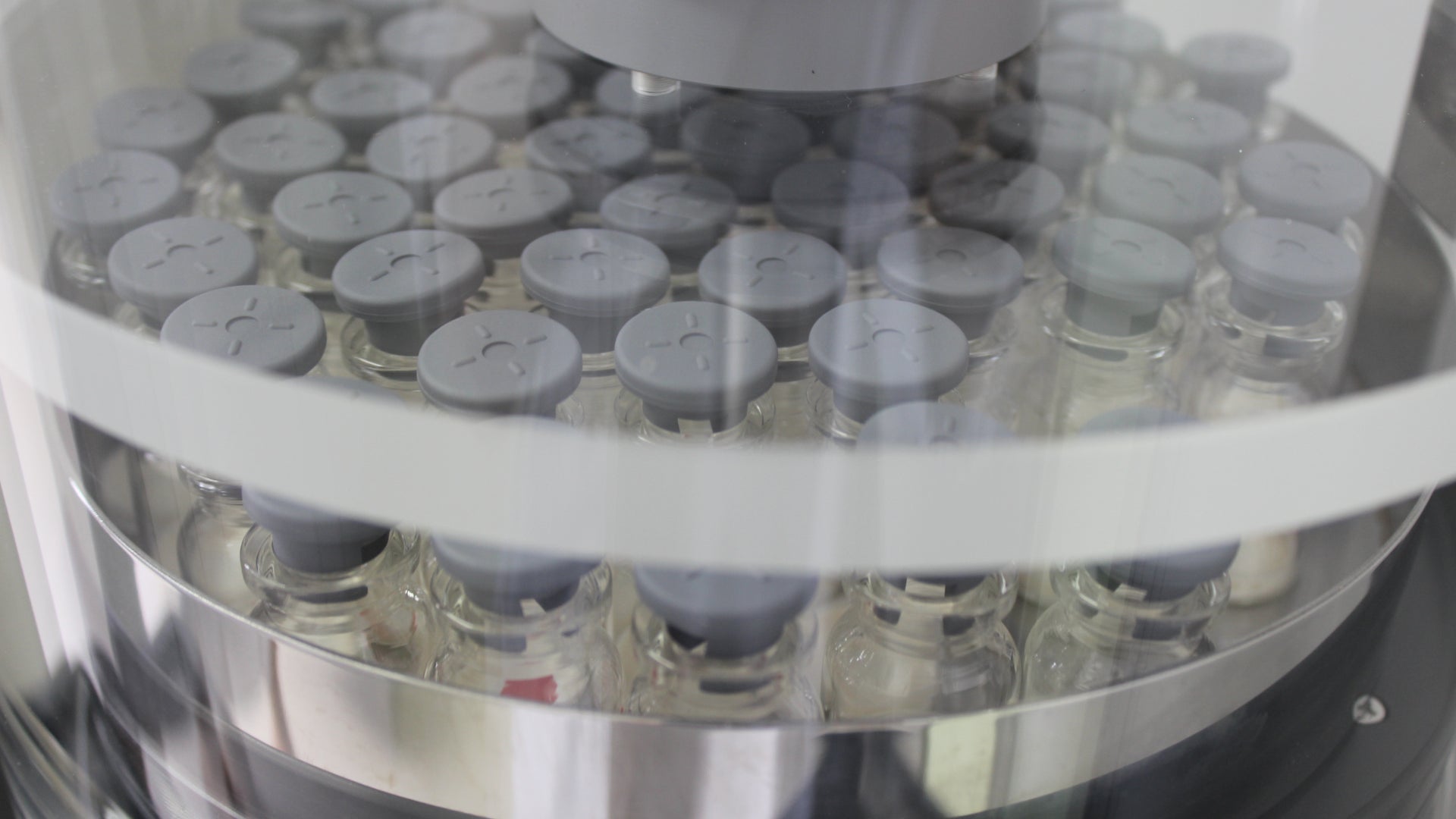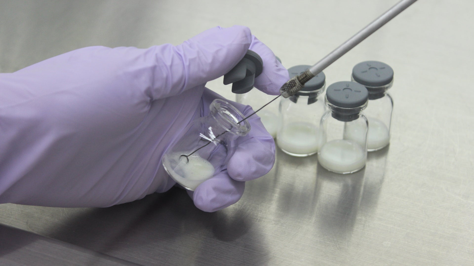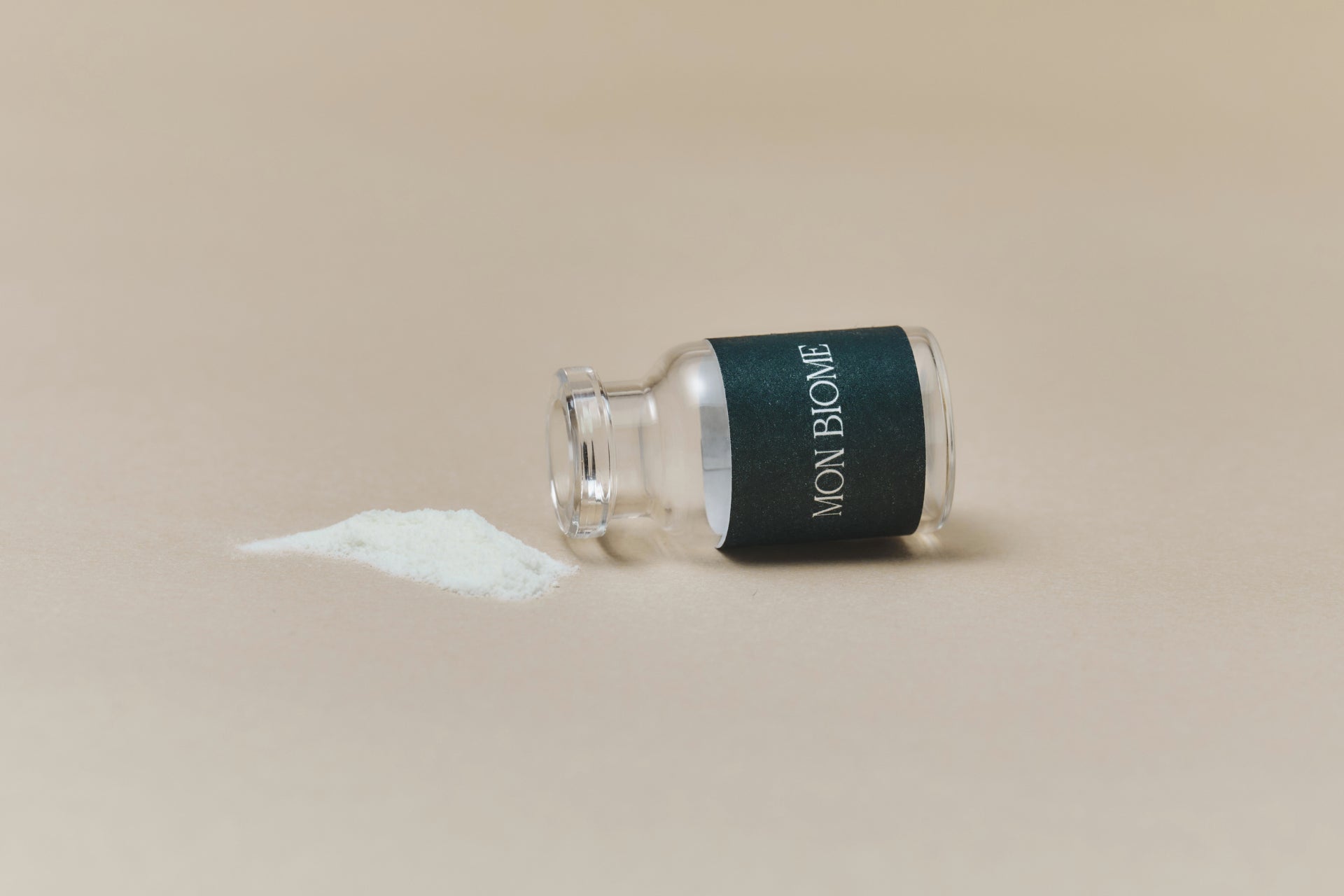 バイアル瓶に入った美肌菌を凍結乾燥し粉末化すれば、あなたの美肌菌でつくる美容液「モンビオーム」の完成です。