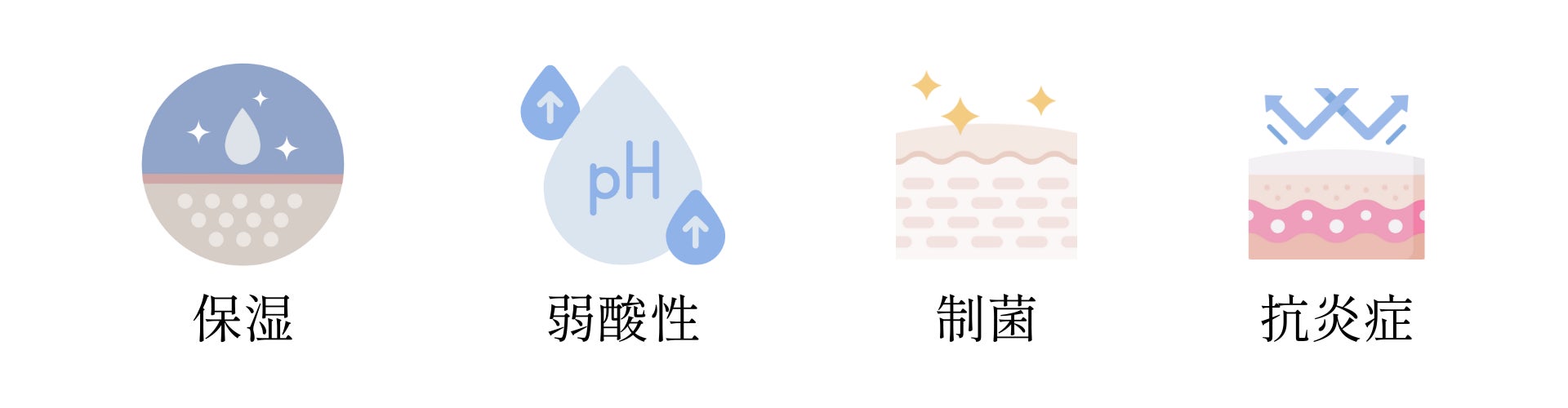 また、肌荒れの原因とされる「黄色ブドウ球菌」などの悪玉菌の増殖を抑える抗菌ペプチドも産生することで肌を制菌し、さらに脂肪酸の産生による抗炎症バリアも構築します。