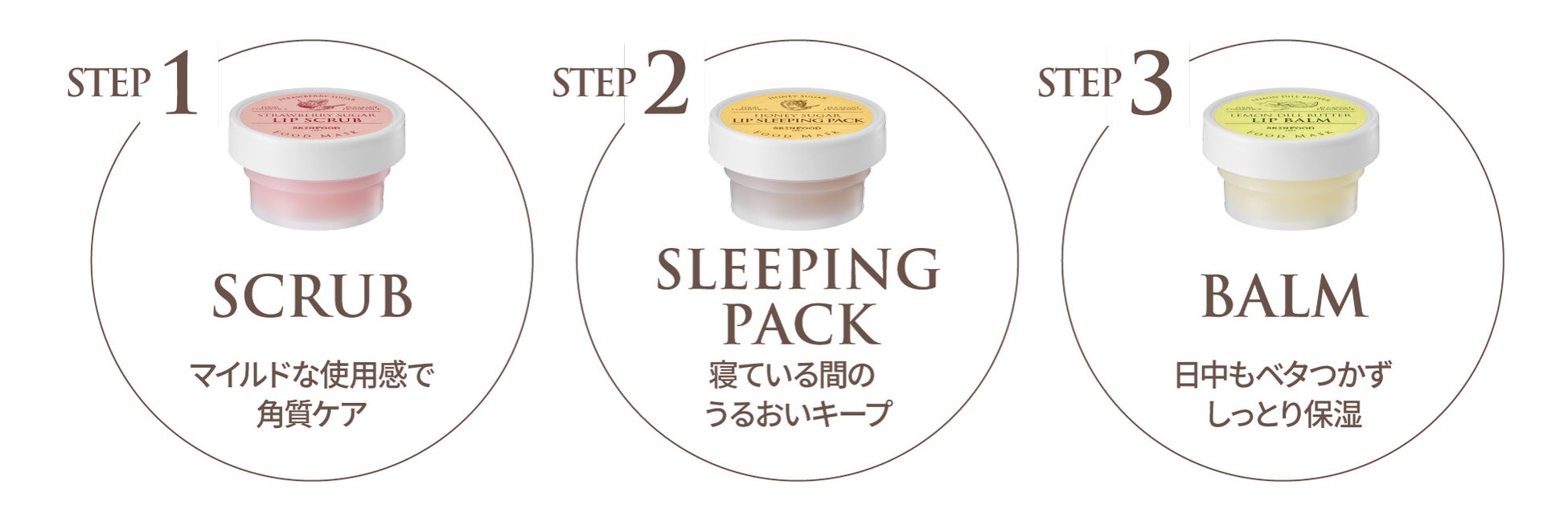 SKINFOODからスクラブ・スリーピングパック・バームの3つの質感で叶えるうるツヤリップ3種が登場。