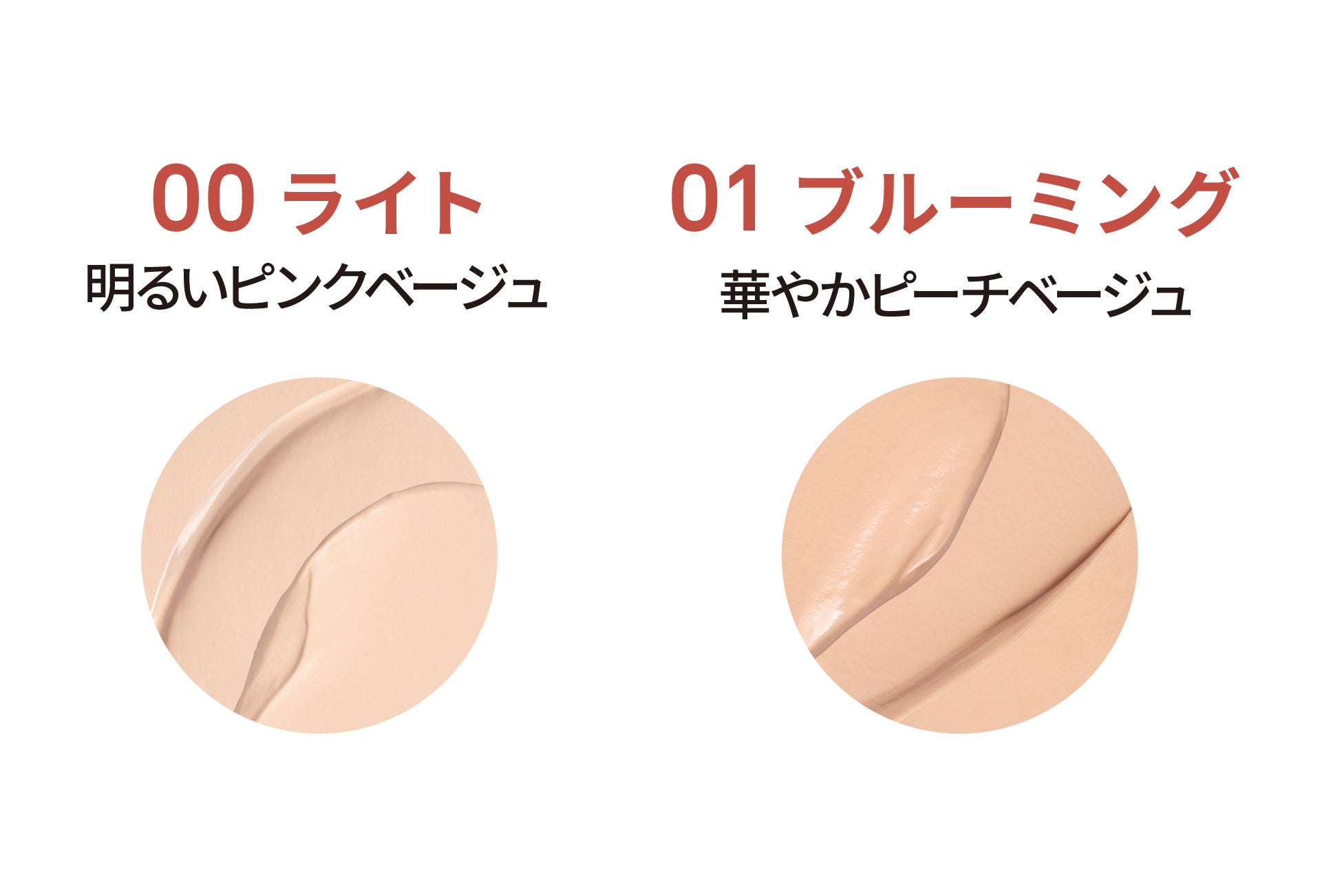 明るいトーンに仕上がるピンクベージュカラーの「00ライト」と血色感のある華やかなピーチベージュカラー「01ブルーミング」の2色で、好みやお悩みに合わせてお選びいただけます。