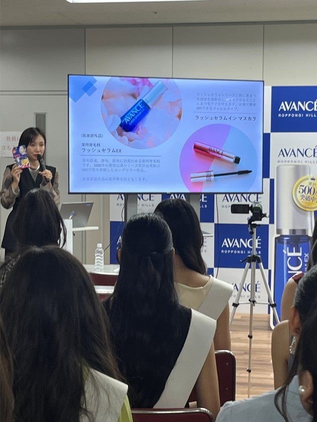 当日はアヴァンセのブランドPR担当より、まつ毛を健やかに保ちながら美しい印象を演出する製品の特長や使用方法が紹介されました。アヴァンセが掲げる“美しさを内面の力に変えていく”というメッセージ通じて、挑戦を続ける彼女たちにエールを送りました。