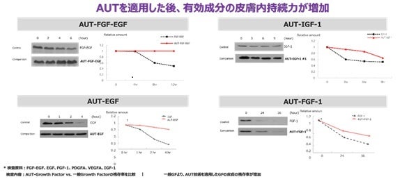 ユビキチンがヒューグロペプチドに対して分解目印(タグ)を付けるのを抑制する事でヒューグロペプチドを分解されにくくし、長時間成分の効果を留める技術です。