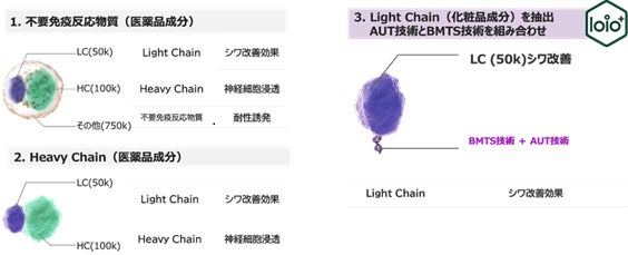 ボツリヌス毒素を加工した成分を使用し、医療用の製剤にしたのが、ボツリヌストキシンです。効果は筋肉を緩める作用があることから、顔面痙攣や眉間・目尻のしわ、食いしばりや歯ぎしりの改善など、さまざまな治療に使われており、美容クリニックの人気施術のひとつになっています。「医療研究所」BioPlus社は、ボツリヌストキシンに着目し、独自の特許技術を用いて、そのボツリヌストキシンからお肌にハリのある状態にする美容成分(LC:ライトチェーン)だけを抽出して作られた美容液の開発に成功しました。