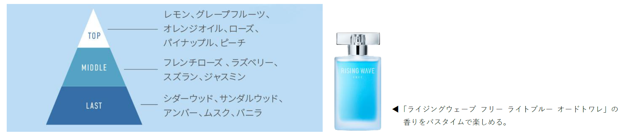 ライジングウェーブのシャンプー/トリートメントは、ブランドで最も人気の香り「ライジングウェーブ フリー ライトブルー オードトワレ」を基調としています。