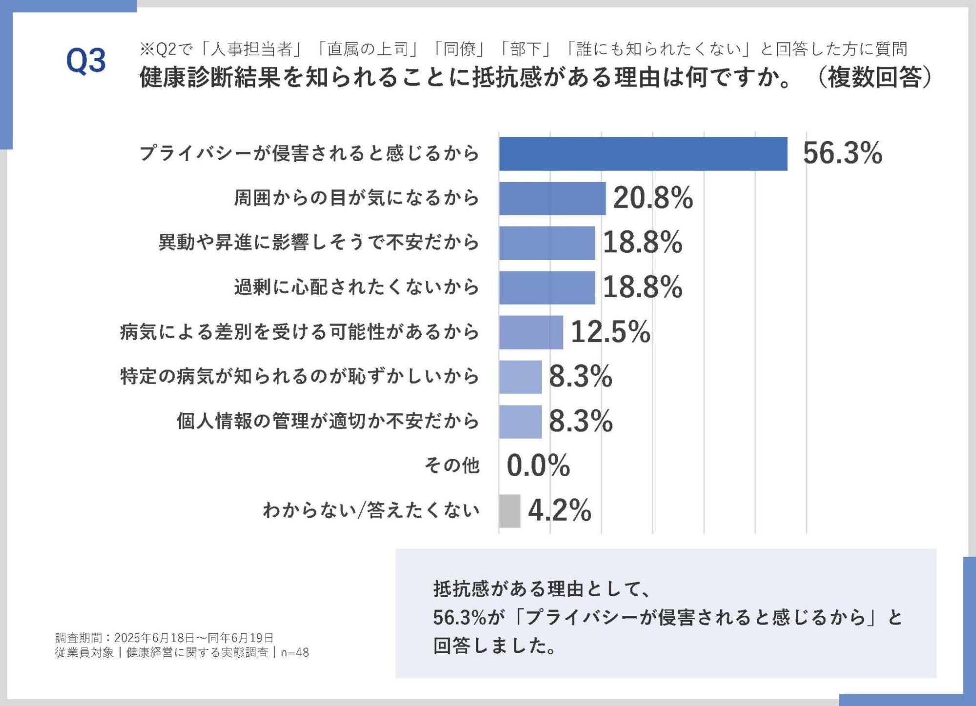 56.3%の従業員が「プライバシーが侵害されると感じる」という理由で、健康診断結果を知られることに抵抗あり
