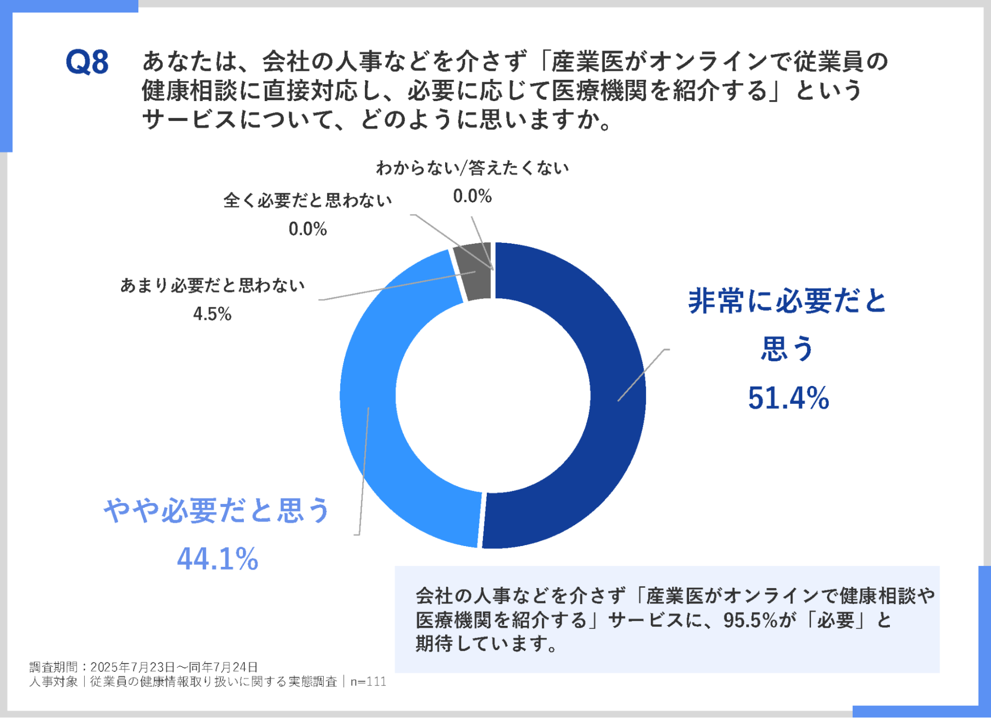 調査説明:本調査では、健康診断後のフォロー体制における人事担当者の負担とプライバシー配慮の難しさが浮き彫りに。約7割が「声かけの気まずさ」を感じており、専門性と配慮の両立が課題です。一方で、9割以上がオンラインで産業医が直接対応する仕組みを必要と回答しており、今後は人事を介さず専門家が支援する新たな健康管理体制の構築が求められる結果に。