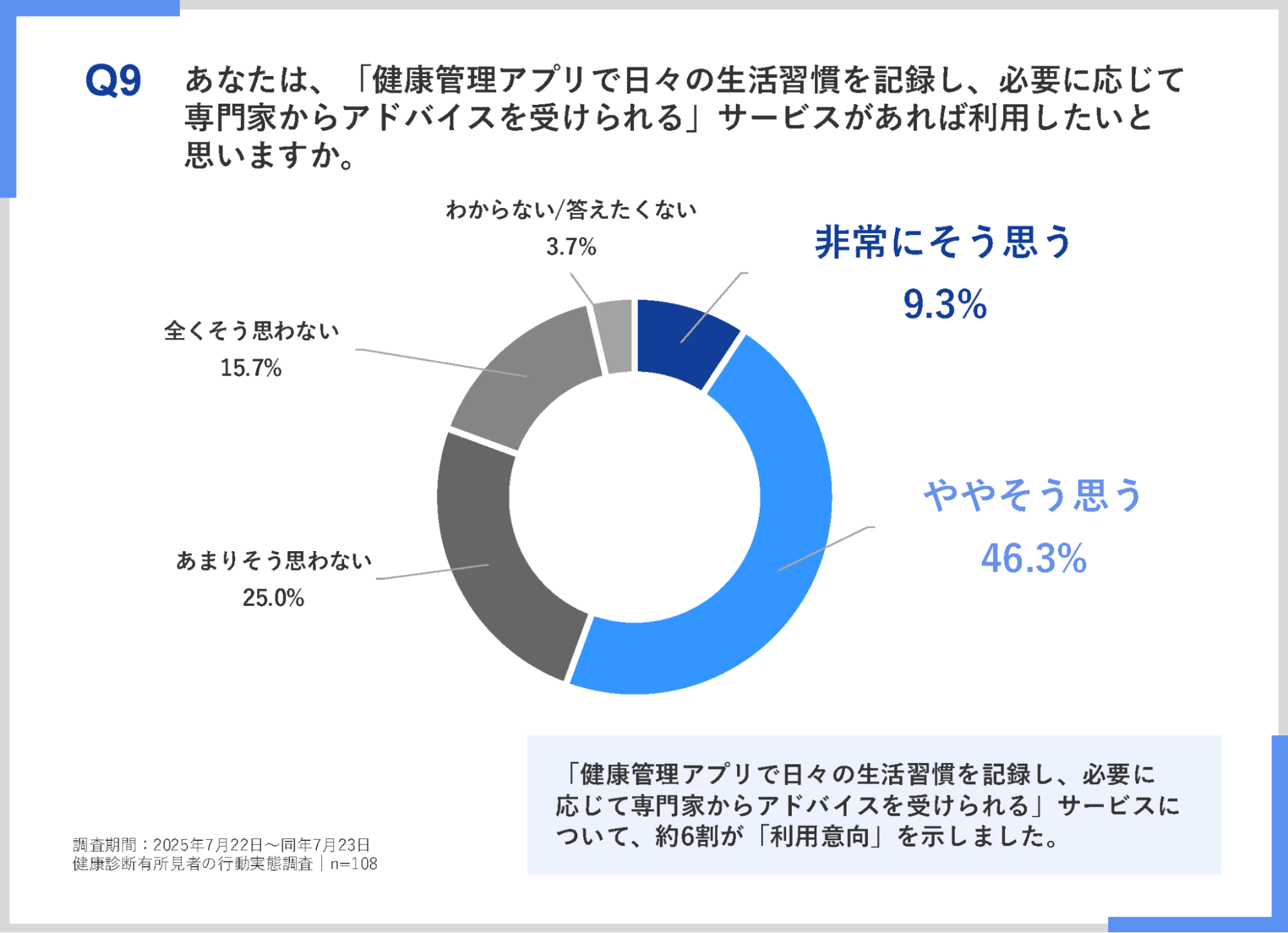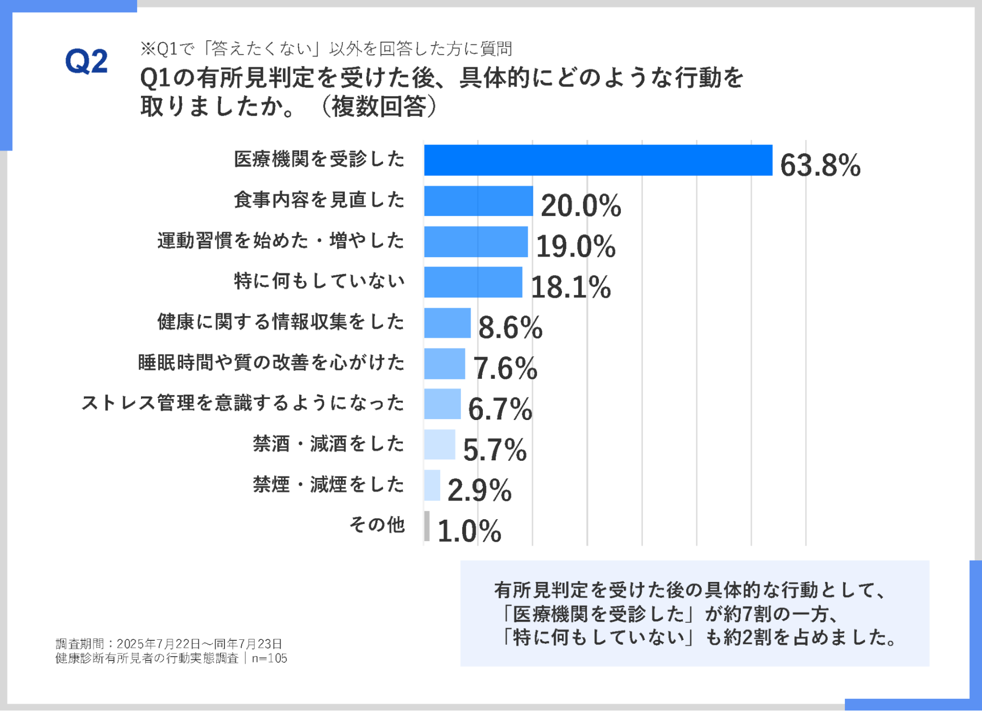 調査説明:本調査では、健康診断で生活習慣病関連の有所見判定を受けた方の多くが、受診後の継続的な改善に課題を抱えている実態が明らかになりました。約2割は「特に何もしていない」と回答し、健康行動の継続の難しさが壁に。一方で、約6割が健康アプリや専門家サポートの利用を希望しており、企業による継続支援体制の整備が求められています。