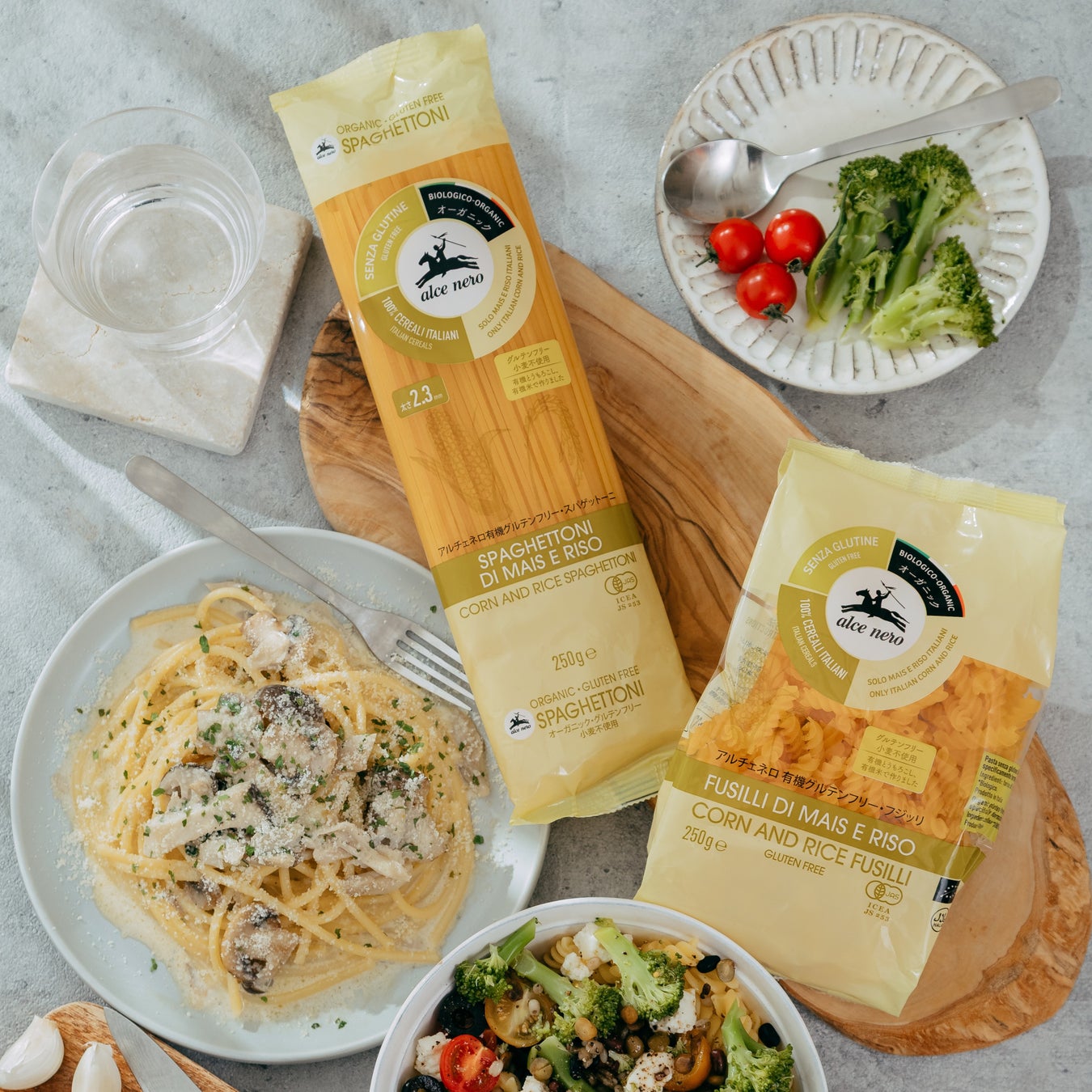 アルチェネロのグルテンフリーパスタは、イタリアで有機栽培されたとうもろこしと米のみを原料に作られているので、オーガニックかつ「小麦不使用」。ほんのりと穀物の甘さが感じられて、もちもちとした食感をお楽しみいただけます。