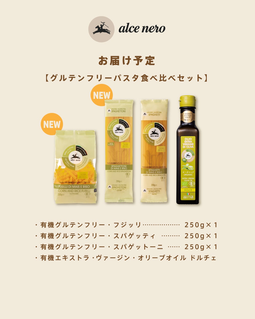 人気のアルチェネロのグルテンフリーパスタシリーズから、フジッリとスパゲットーニ (太さ2.3mm) が新登場。今回のキャンペーンでは、定番人気のスパゲッティ(太さ1.6mm) と一緒にセットでプレゼントいたします。