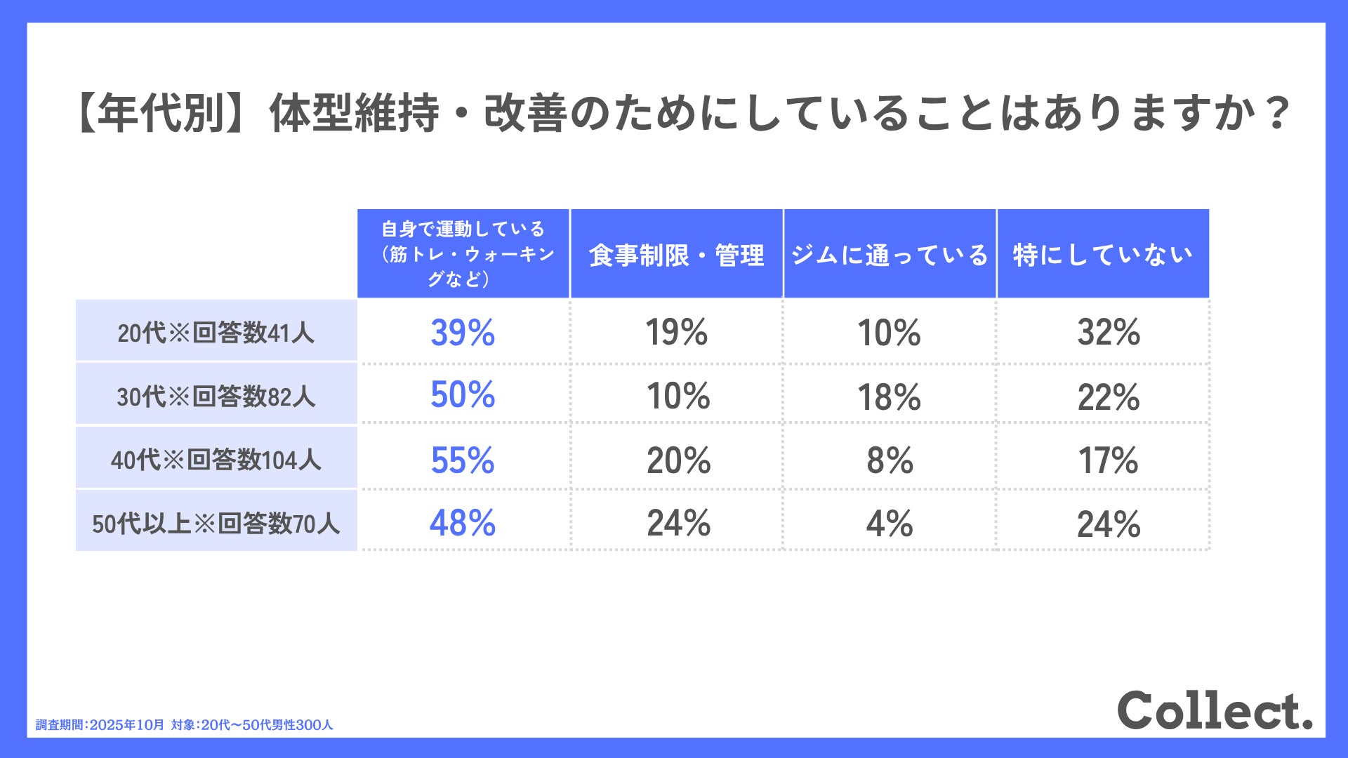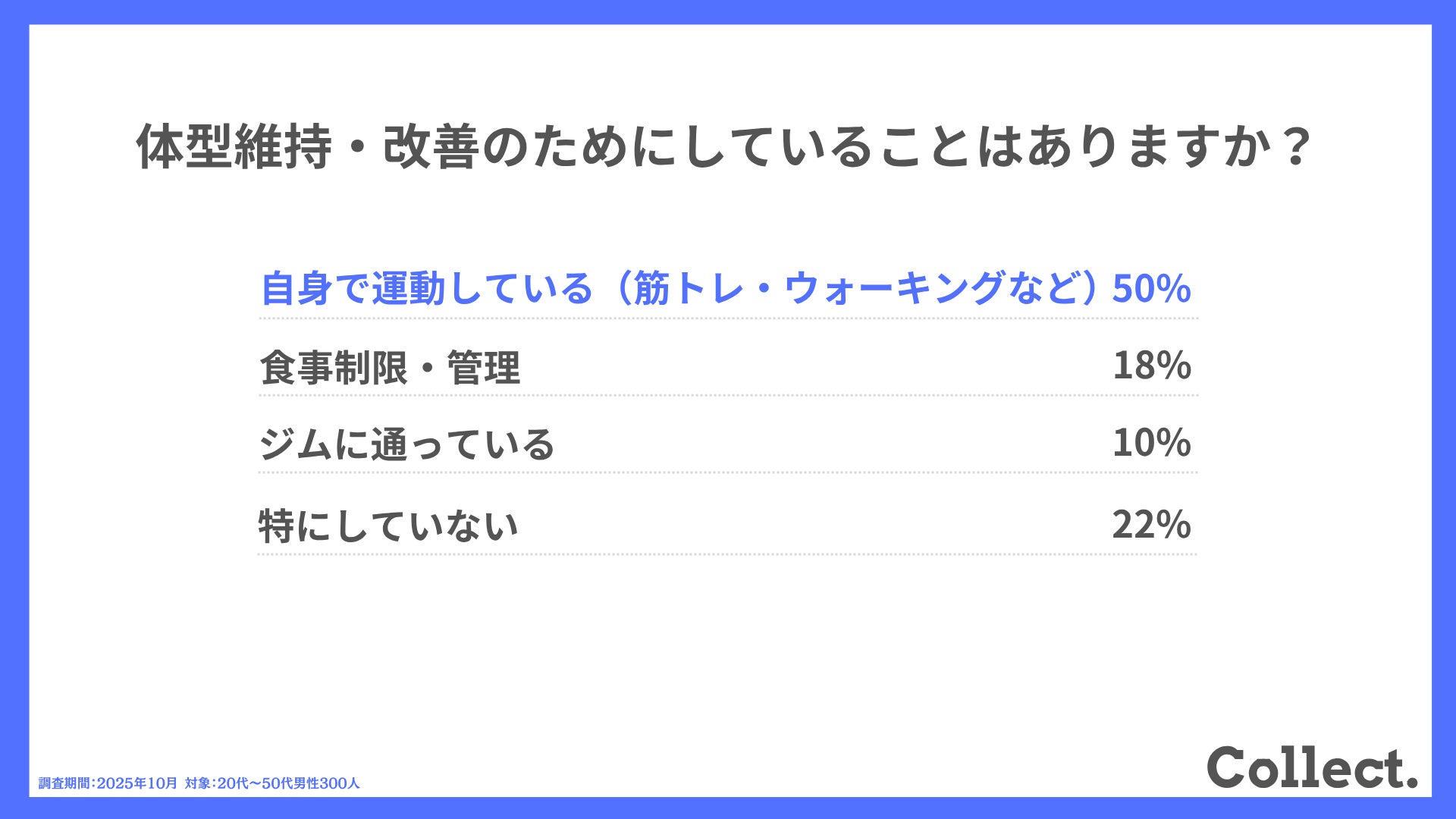 ディーエムソリューションズ株式会社(東証スタンダード上場)が運営するメディア「Collect.(コレクト)」では、男性300人に体型維持・改善に関するアンケート調査を実施しました。