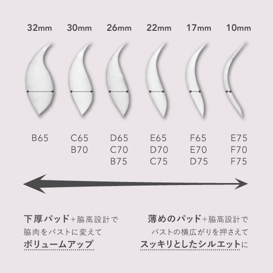 カップの厚みをバストサイズごとに設計することで、どのサイズでも美しいまるみのあるバストシルエットを実現します。