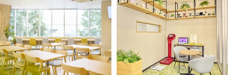 店内に併設するカウンセリングルームには、タニタのプロフェッショナル仕様の体組成計「MC-980A-N plus」や脚の筋力をはかることができる運動機能分析装置「zaRitz」などを設置。計測結果に基づいて、常駐する管理栄養士が食事を中心とした健康アドバイスを行います。食事を注文した方が無料で利用でき、肥満や運動機能の低下の解消やからだづくりなど、食と計測の両軸で健康づくりをサポートします。この他店内には靴を履いたまま計測できる体組成計「DC-13C」や血圧計も設置しており、自由に利用することができます。