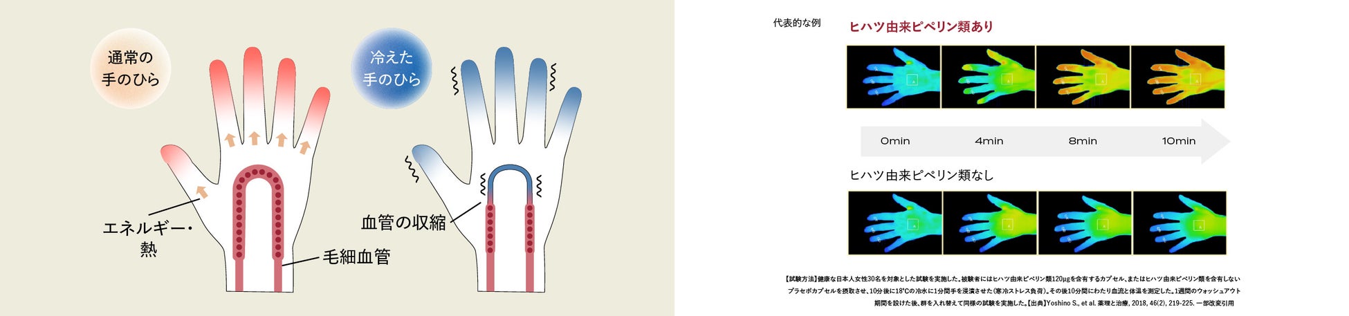 ヒハツ由来ピペリン類は毛細血管に作用し血管の収縮を緩和し、血液循環を促進することで末端への血流を改善します。その結果、手足の冷えが軽減され体温バランスが整います。実際にヒハツ由来ピペリン類を用いた検証では、摂取から10分後の温度変化で冷えの軽減が確認されました。