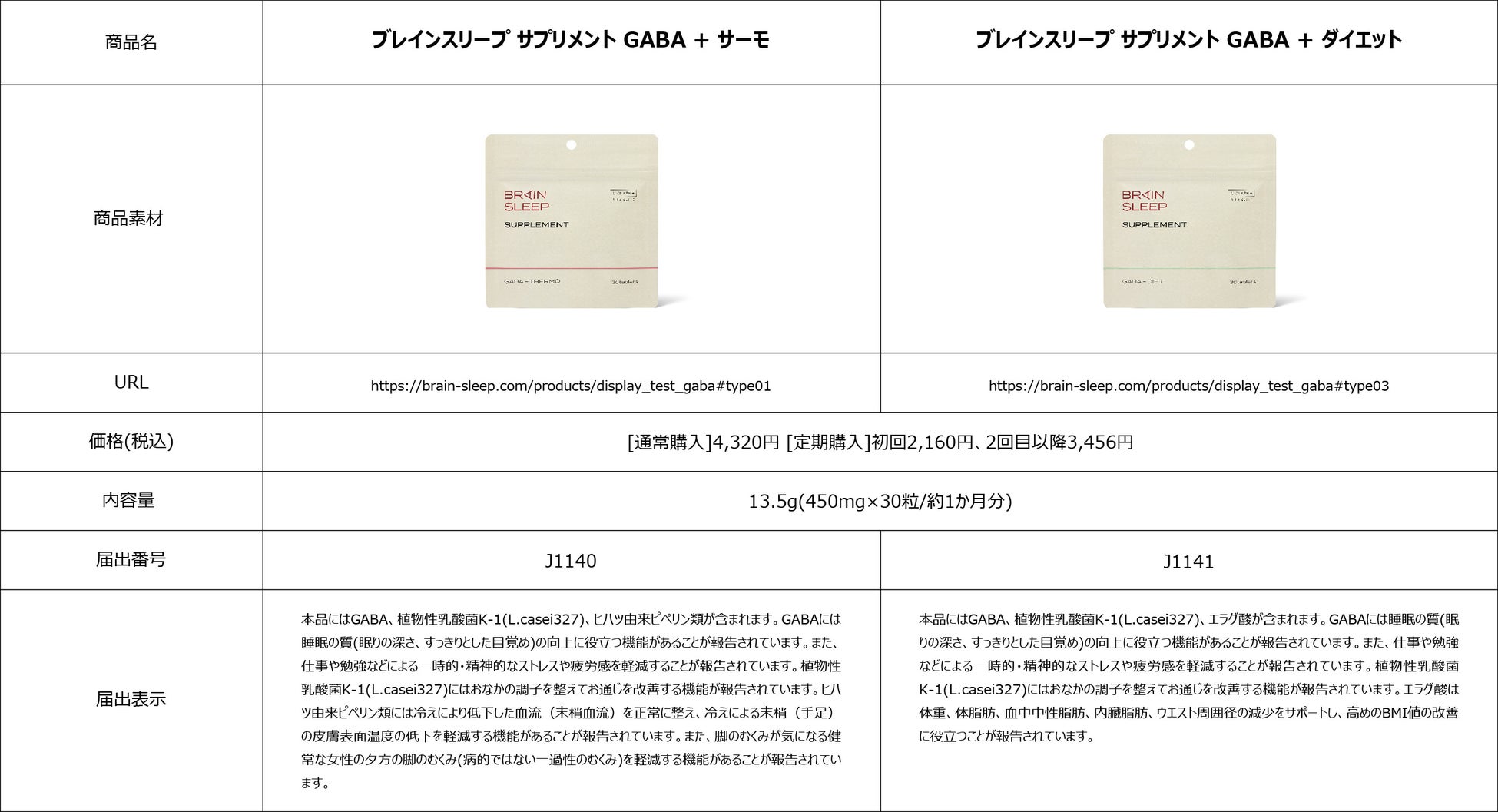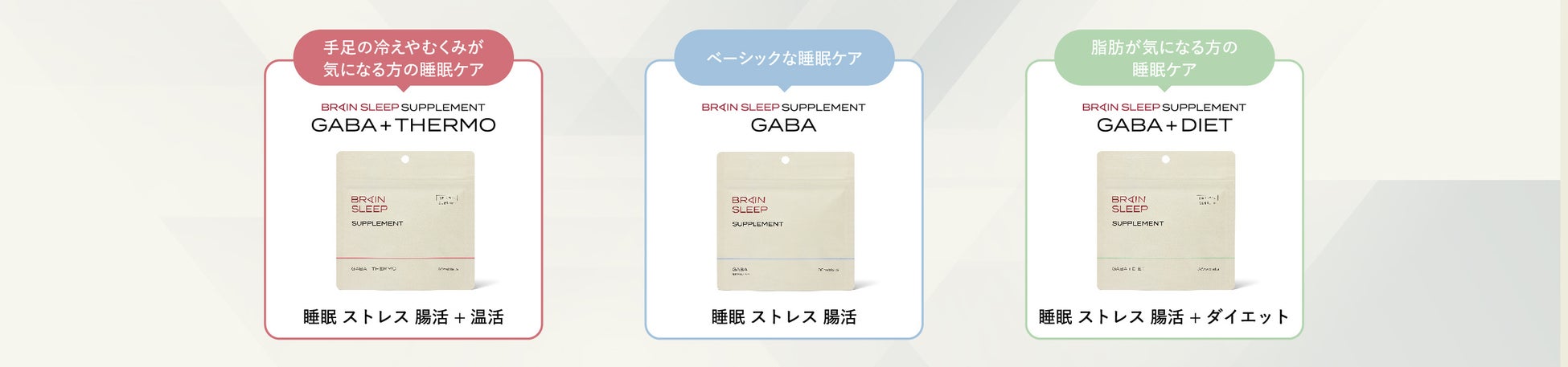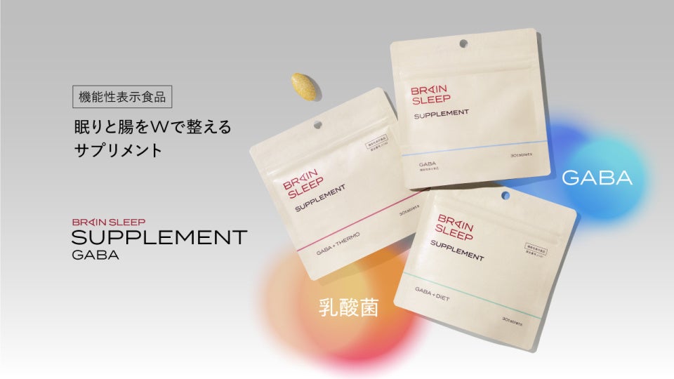 株式会社ブレインスリープ(本社:東京都千代田区、代表取締役:廣田 敦、以下「ブレインスリープ」)は、1粒で睡眠の質を向上させながら健康課題にアプローチする、機能性表示食品である多機能睡眠サプリメント「ブレインスリープ サプリメント GABA」(以下「サプリメント GABA」)シリーズの新商品として、温活に特化した「ブレインスリープ サプリメントGABA + サーモ」(以下「サプリメント GABA サーモ」)、ダイエットに特化した「ブレインスリープ サプリメントGABA + ダイエット」(以下「サプリメント GABA ダイエット」)をブレインスリープ オフィシャルサイトにて10月22日(水)より発売します。睡眠の質向上やストレス・疲労感を軽減する<GABA>とおなかの調子を整える<乳酸菌K-1>に手足の冷えや脚のむくみを軽減する<ヒハツ由来ピペリン類>や体重、体脂肪、中性脂肪、BMI値を改善する<エラグ酸>をそれぞれ追加し、睡眠の質向上&ストレス軽減に腸のケアを加え、さらに温活やダイエットをサポートします。