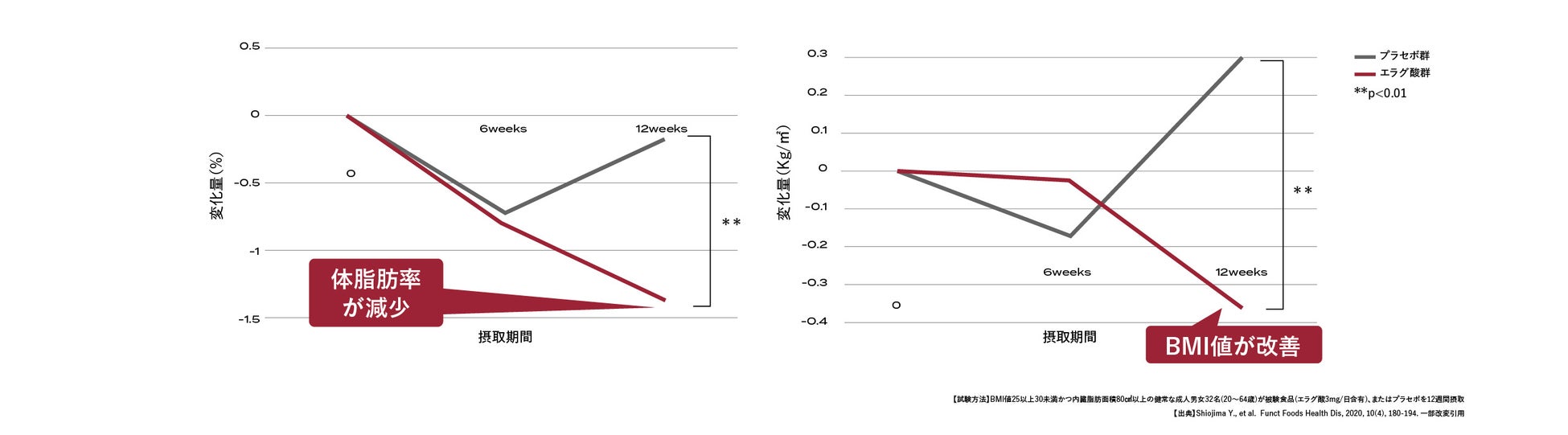 体重増加は基礎代謝の低下や脂肪の蓄積によって起こります。機能性関与成分エラグ酸が脂肪代謝に働きかけ、体重や体脂肪の減少をサポートします。さらに代謝機能の向上により、健康的な体型維持にも役立ちます。実際に肥満気味な方を対象に行った検証では、12週間のエラグ酸摂取で体重・体脂肪・血中中性脂肪・ウエスト周囲径が減少し、高めのBMI値が改善しました。