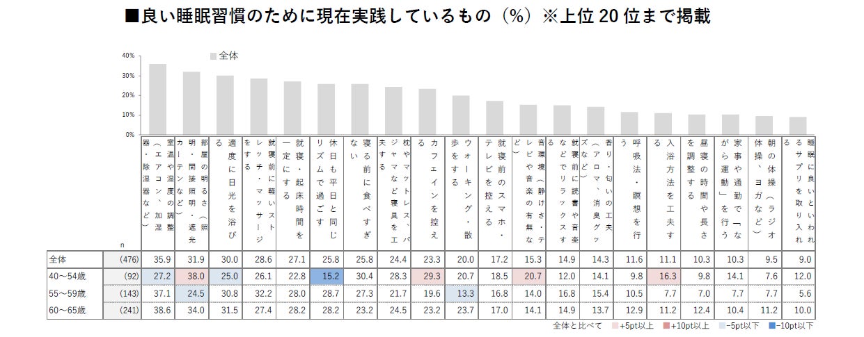 良い睡眠習慣のために実践している事は、「室温や湿度の調整」(36%)「部屋の明るさ」(32%)といった就寝時の空調や調光環境を整えることや、「適度に日光を浴びる」(30%)といった生活リズムを整えることが上位に挙げられている。