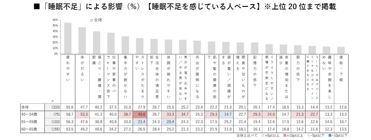 ■「運動不足」と「睡眠不足」の両方を抱える人は全体で60%。「睡眠不足」による影響として40-54歳ではメンタル面を挙げる割合が高い