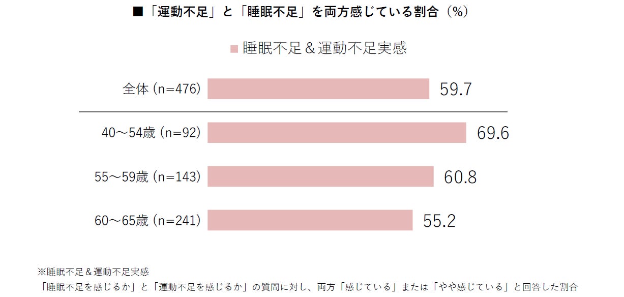 「運動不足」と「睡眠不足」を両方感じている人は全体の60%。40~54歳は70%にのぼる。
