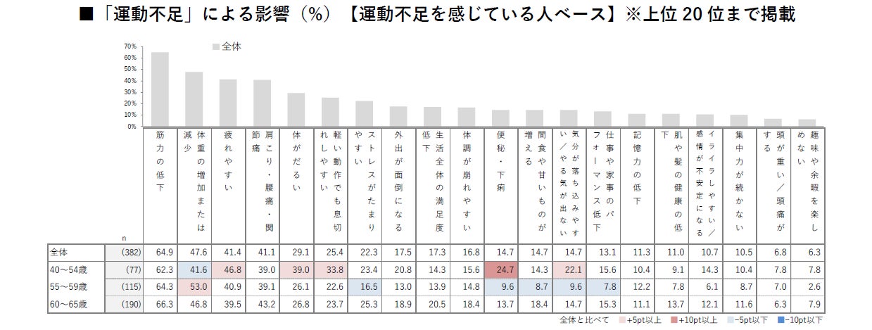 「運動不足」による影響は「筋力の低下」(65%)「体重の増減」(48%)など、肉体面に関するスコアが高い。「便秘・下痢」「気分の落ち込み」は40-54歳で高く、55歳以上では低い。