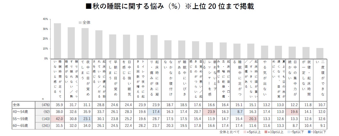 40-54歳女性の46%が「秋不眠=秋になると、眠りの質が下がる」経験があると回答。悩みとしては「睡眠時間が足りていない」「眠りが浅くぐっすり眠れない」など