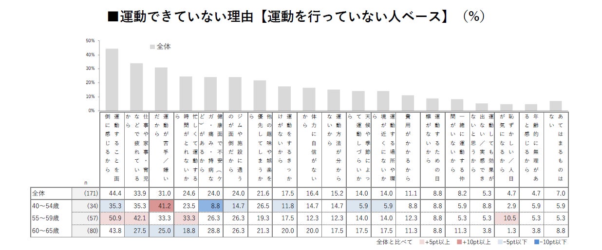 運動を行っていない人のできていない理由としては「運動することを面倒に感じるから」(44%)「仕事や家事・育児などで疲れているから」(34%)「運動が苦手・嫌いだから」(31%)など、心理的・時間的要因が挙げられた。