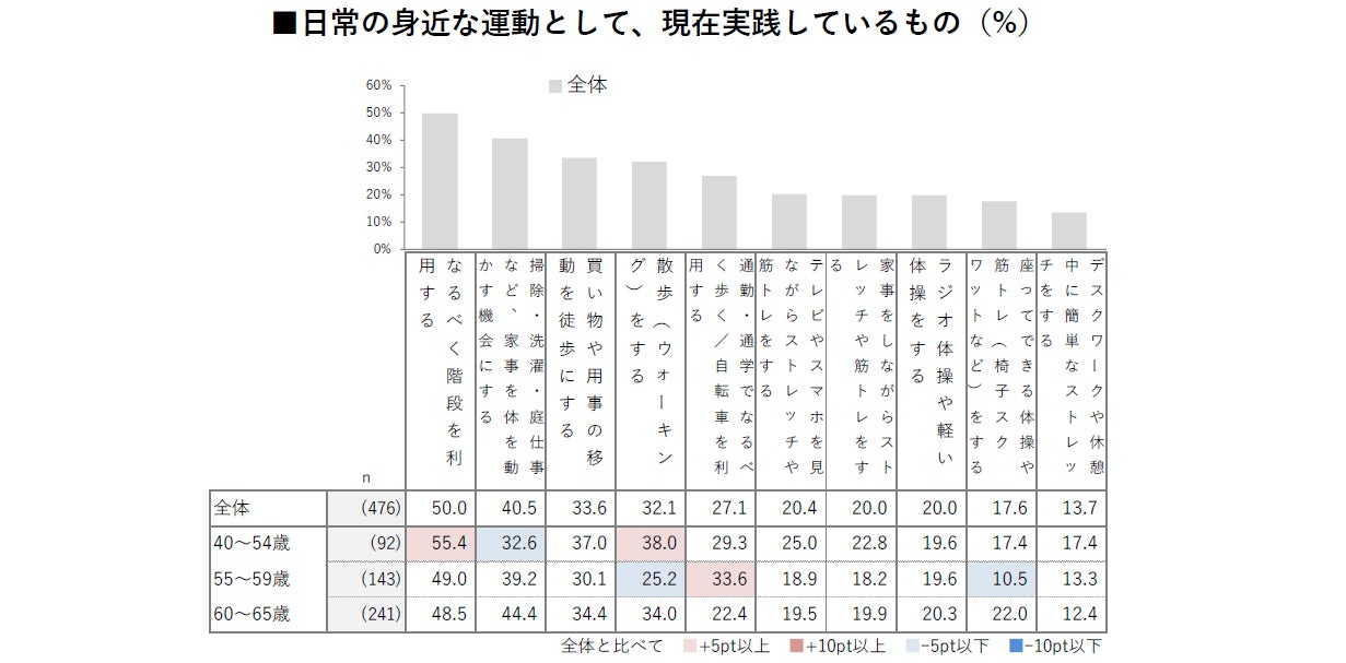 日常の身近な運動として実践しているものは「なるべく階段を利用する」(50%)「家事を体を動かす機会にする」(41%)「買い物や用事の移動を徒歩にする」(34%)などが挙げられた。