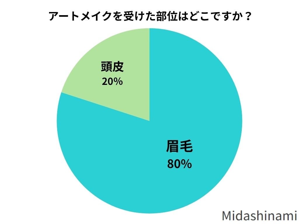 メンズアートメイクの施術部位を質問したところ、「眉」(80%)が圧倒的に多く、施術部位の中心は眉毛であることがわかりました。