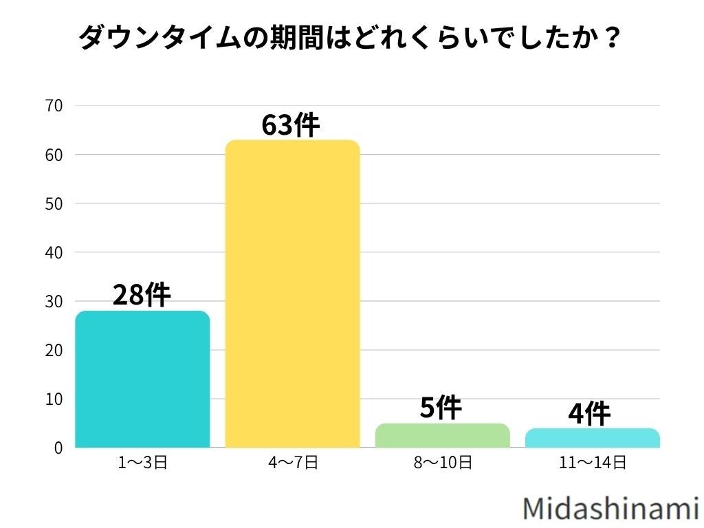 ダウンタイムの期間に対する回答は「4〜7日」(63件)が最も多く、「1〜3日」(28件)の回答も一定数いました。また「8〜10日」(5件)と「11〜14日」(4件)は少数でした。