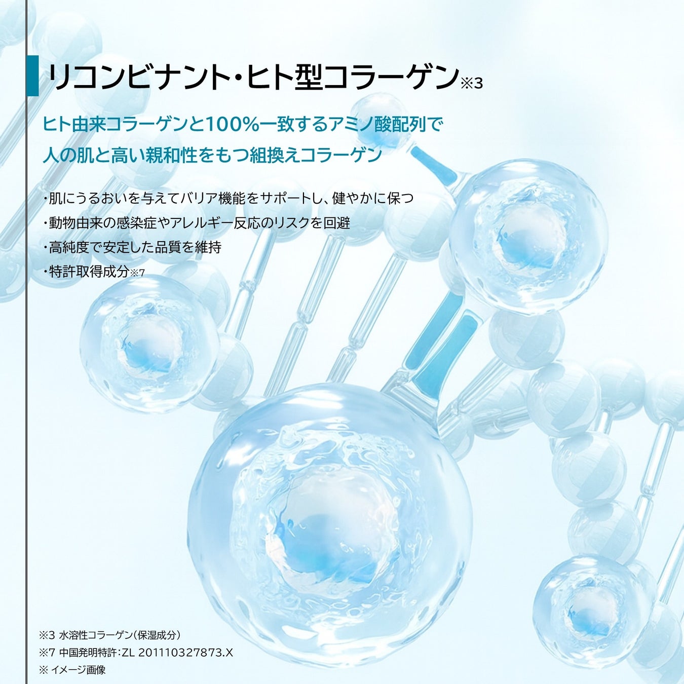 「リコンビナント・ヒト型コラーゲン」は動物やヒトの組織から抽出される天然コラーゲンとは異なり遺伝子組換え技術を用いて生産されるため、安全性・機能性が高く次世代型コラーゲンとして医療と美容の分野で活用される特許取得※7成分です。外部刺激を受けたデリケートな肌にもなじみやすく、うるおいを与え、肌の回復力・バリア機能をサポートします。