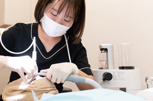 ホワイトニングに興味があるけれど「しみるのが怖い」と感じている方に向けて、500円(税込550円)で体験できる「お試しホワイトニング」のメニューを自由診療でご用意。さらに、微細なパウダーをジェット噴射して歯の汚れを優しく落とす「お試しエアフロー(自由診療 3,000円(税込3,300円))」のメニューもご案内いたします。これらの体験メニューは、見学内覧会時にご予約いただけます。